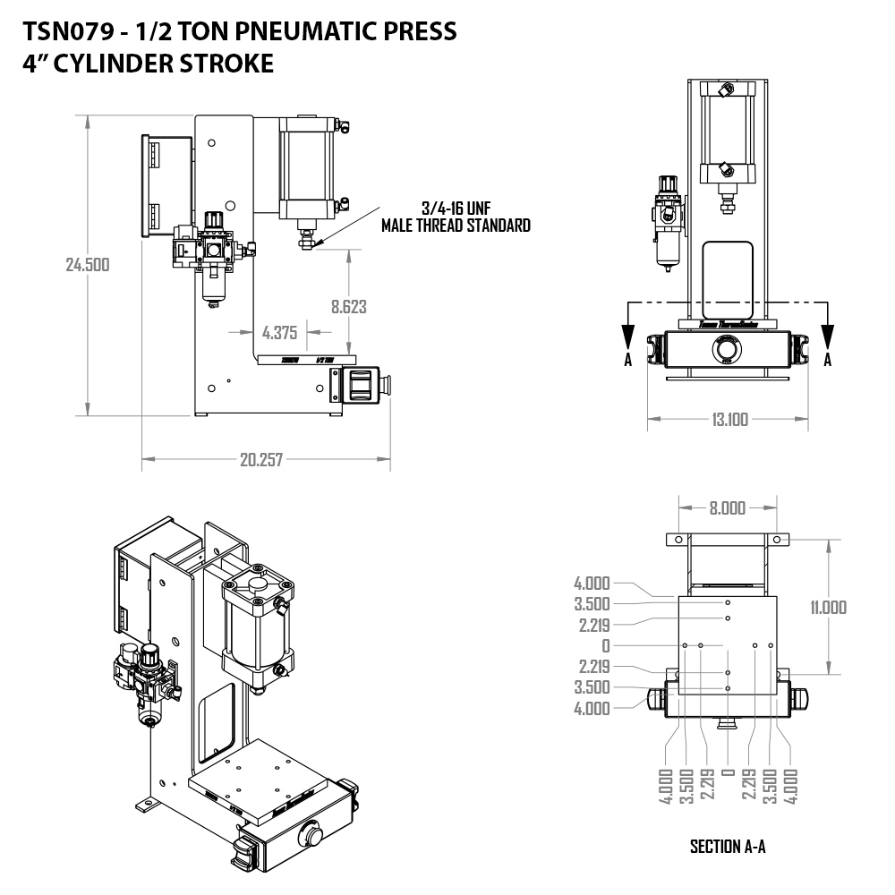 This versatile, all steel constructed, 1/2 ton air press (tonnage based on 80 psi) can be used in punching, crimping or forming your product assembly. It can be easily tooled or retooled using inexpensive, standard die sets.